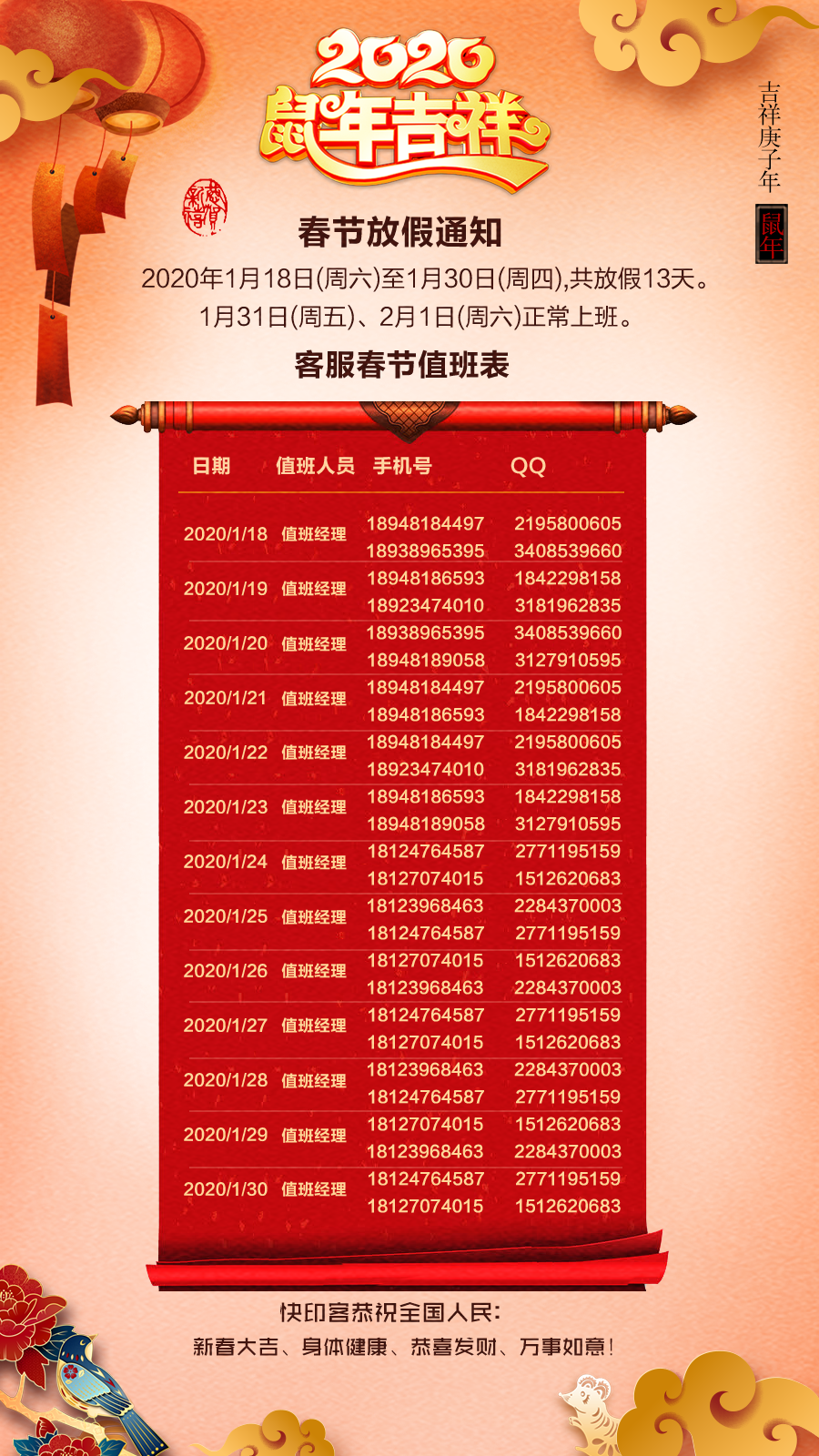 值此2020年新春佳节到来之际,快印客全体员工向大家致以最亲切的问候,给大家提前拜年了,衷心地祝福您及您的家人新春愉快!身体健康!阖家欢乐!根据国务院办公厅关于2020年春节放假安排,同时结合公司的实际情况,公司2020年春节放假具体安排如下: