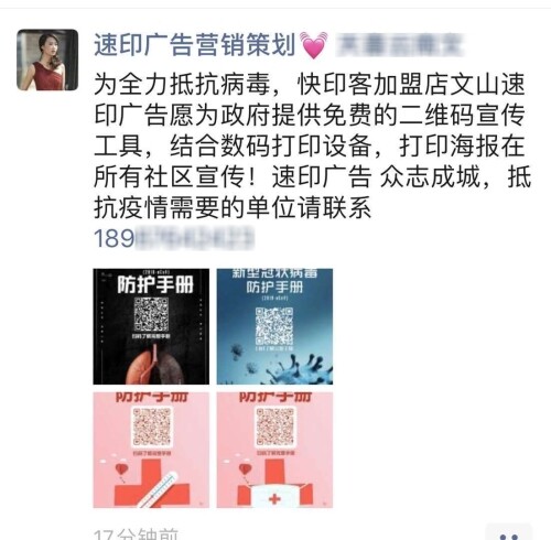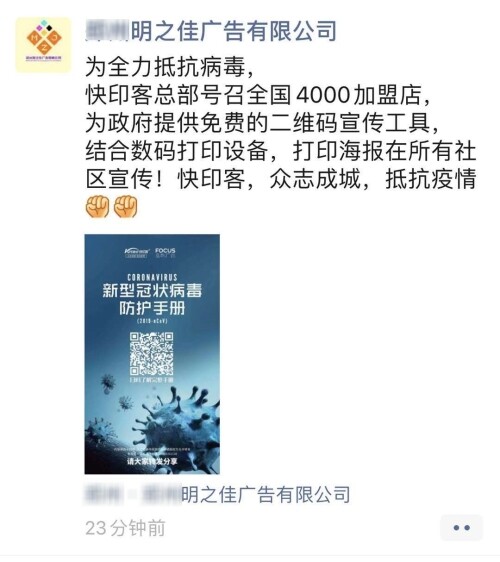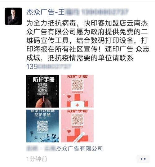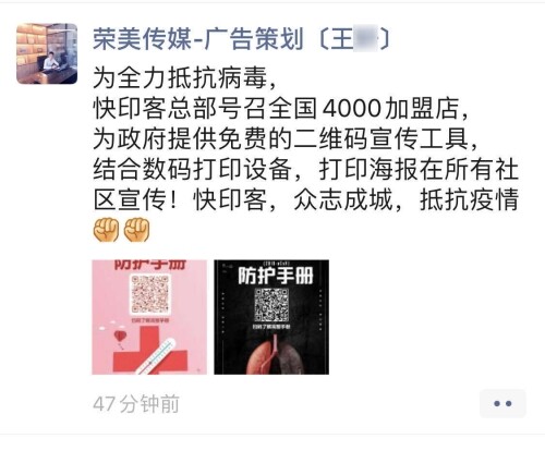 昨日,在快印客总部的倡导下,快印客旗下4000加盟店纷纷践行社会责任,全力支持疫情防控,为各级政府单位、街道社区、各村委会提供免费的二维码应用服务,用于疫情宣传、防护的分享传播。希望能够触达更多民众,共筑疫情防控堤坝。
