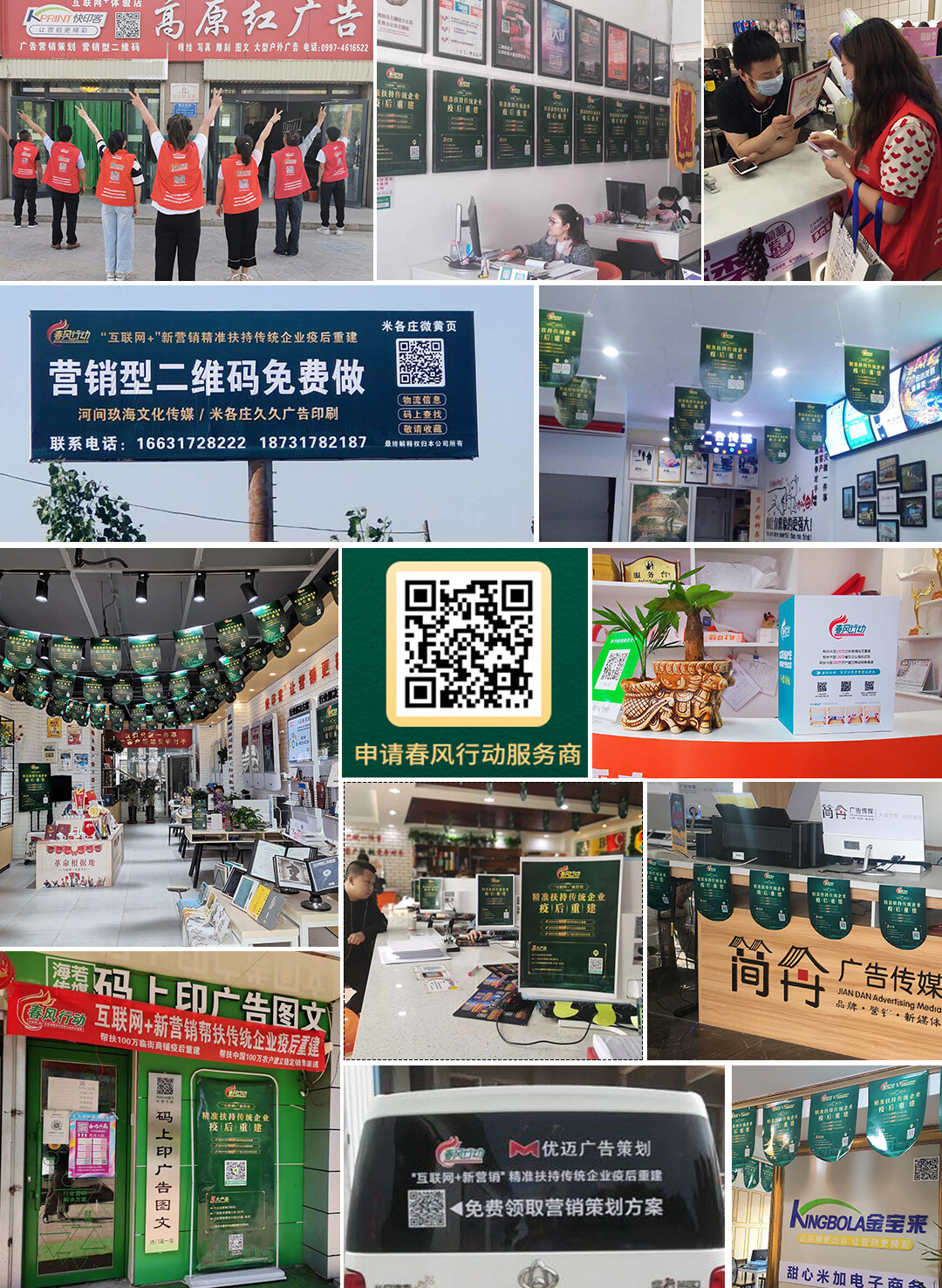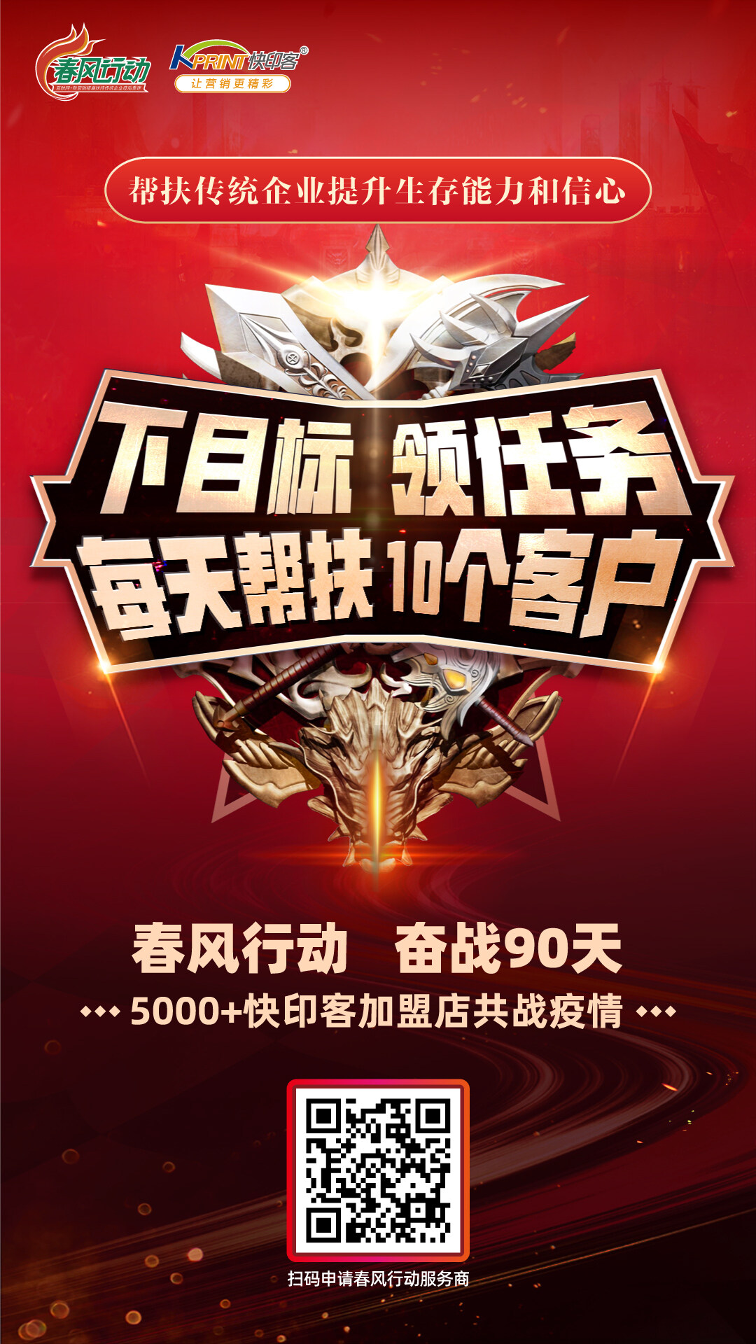 企业的核心本质是营销,而所有的营销都是从广告开始的。 因此,对于广告人来说,我们不仅仅要帮助客户制作广告宣传物料,更有义务帮助传统企业的实现营销的振兴,利用互联网 技术营销工具帮助传统企业打造“线下 线上”相结合的营销模式,帮助传统企业实现疫后重建。春风行动包括三大使命:帮扶中国100万临街商铺疫后重建;帮扶中国100万餐饮企业摆脱团购;帮扶中国100万农户建立稳定销售渠道。 看看快印客加盟店是如何做的?如何履行春风行动的使命!