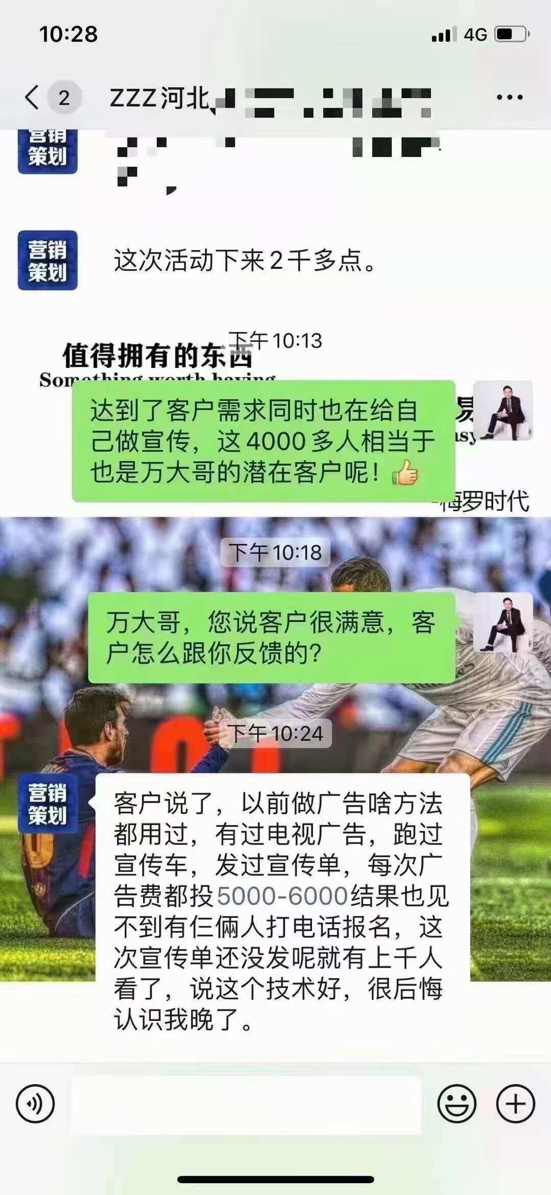广告做完之后,3天浏览4000多次,帮助客户成交10多个报名,客户很满意,大有相见恨晚之意。让我们看看幼儿园客户怎么反馈的——“以前做广告啥方法都用过,有过电视广告,跑过宣传车,发过宣传单,每次广告费都投5000-6000,结果也见不到两三个人打电话报名,这次宣传单还没发呢,就有上千人看了,这个技术好,很后悔认识晚了。”