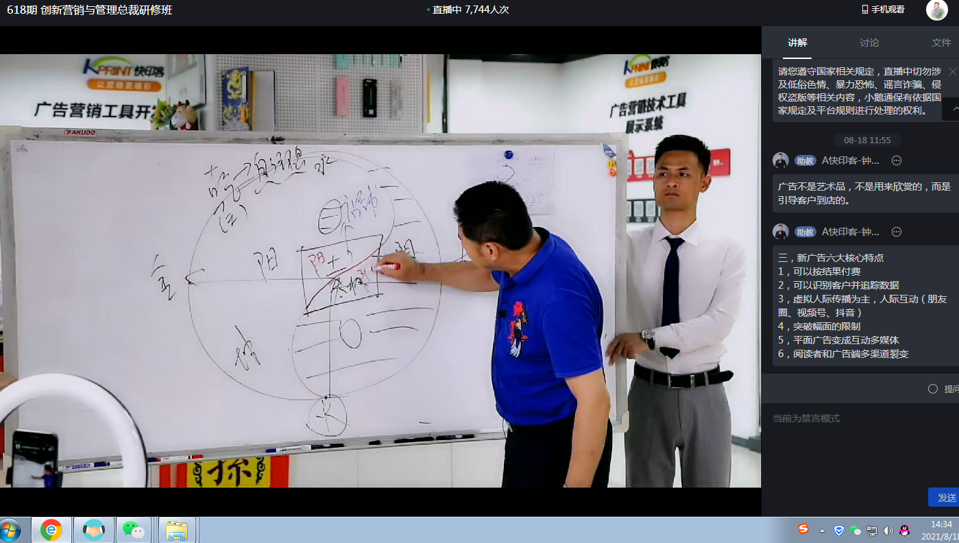 8月18日—19日,第618期新研社创新营销与管理总裁研修班线上开播,上万广告店共同跟随牛云老师,学习新的广告行业新营销理论实战体系,通过“四维广告营销学”,学习广告行业如何帮助传统企业客户,参与到客户的销售环节,通过广告为客户带来新的生机。