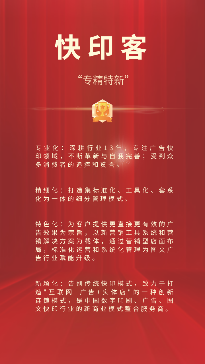 未来,快印客会坚定不移地走“专精特新”的发展道路,加快核心竞争力,持续赋能凯发娱乐下载的合作伙伴,期待能在不断构建的新发展格局中发挥更大的作用。