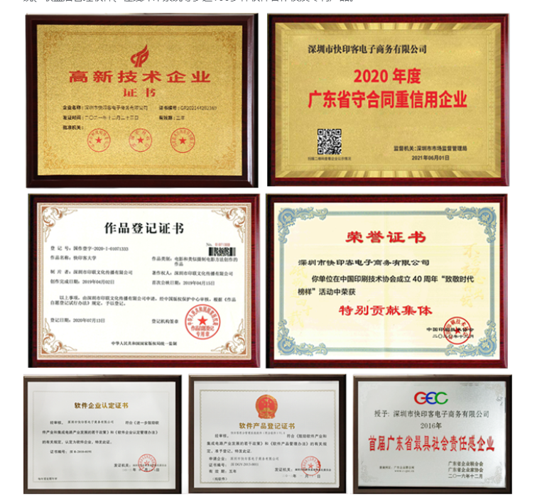快印客拥有手持移动终端分等级显示平台、一种生成文字二维码的方法、防盗刷支付二维码生成系统等3项发明专利,拥有广告机等1项外观专利,拥有智慧云码广告技术营销工具系统、轻站模块式自助建站系统,ai智能名片全场景营销名片系统、魔术贴二维码可变数据系统、溯源码产品原产地数字追踪系统、数字化管理平台系统、乡村振兴整合传播系统等近200种软件著作权。