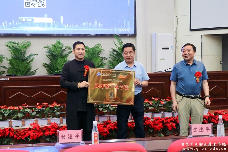 7月6日上午,我校与深圳快印客投资管理有限责任公司联合开办的快印客产业学院揭牌仪式在智敏学术报告厅隆重举行。甘肃工业职业技术学院党委副书记、院长安建平,深圳快印客投资管理有限责任公司董事长王继春,甘肃林业职业技术学院院长陈逸平,甘肃机电职业技术学院院长赵彦军,天水师范学院美术学院院长刘晓毅,甘肃天创广告有限公司总经理陈秉良,天水码上印文化传播有限公司总经理程华等出席揭牌仪式。来自陕西、浙江、重庆、四川、贵州、青海、河南、河北、云南、山东、新疆、内蒙古、甘肃等地70余家知名企业负责人及校企双方师生、职工代表参加了揭牌仪式。仪式由党委副书记郭建忠主持。