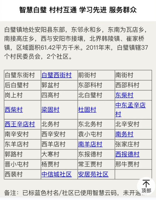 白璧镇共有41个行政单位,通过一个村牌的扫码,可以跳转到其他40个村,达到村与村之间相互引流的目的。