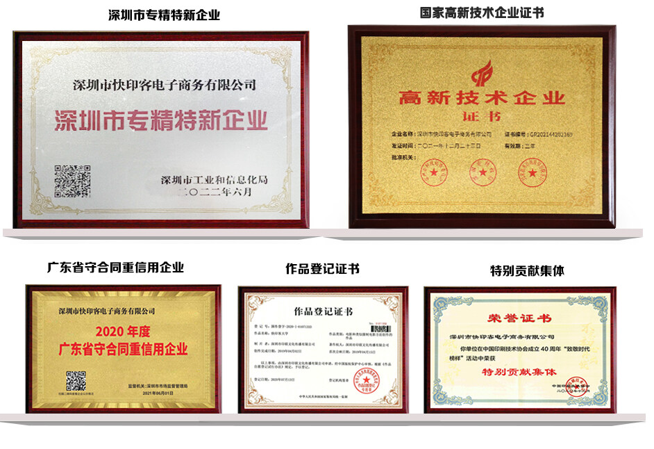 企业荣誉及影响力:快印客成立十三载以来,始终秉持“专业,敬业,卓越”的经营理念,连续十年荣获国家高新技术企业证书,是国家双软认证企业,荣获深圳市2021年度“专精特新”企业,还是深圳市创新型中小微企业、广东省著名商标企业、深圳市重点电子商务企业、广东省最具社会责任感企业、2019、2020年度连续荣获“广东省守合同重信用企业”、2022年荣获“深圳市2022年高新技术企业培育资助企业”。未来,快印客还将继续发挥技术优势,加大技术研发投入,发挥“高新技术企业”的创新示范作用。