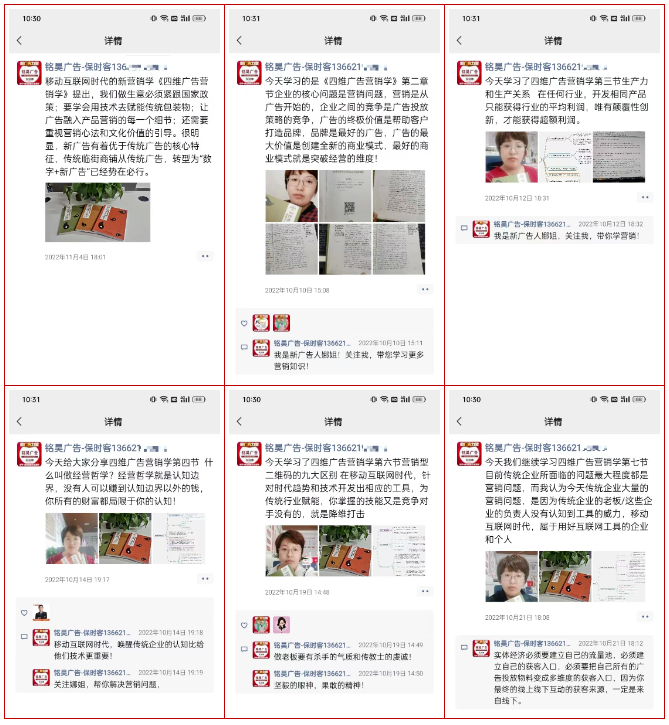 铭昊广告的娜姐,在学习牛云老师的著作《四维广告营销学》时,会在朋友圈发布自己的学习进度,总结每一节的思维导图,认真的求知态度打动了很多客户。