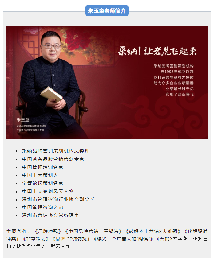 朱玉童老师是著名品牌营销策划专家、中国十大策划人,他不但在营销思维上有着独到的见解,并且有着丰富的营销实战经验。27年来,他带领“采纳”以打造领导品牌为使命,助力众多企业实现业绩翻番,甚至业绩增长过千亿。服务中国500强企业超过68家,连续十一次夺得过中国杰出营销奖。