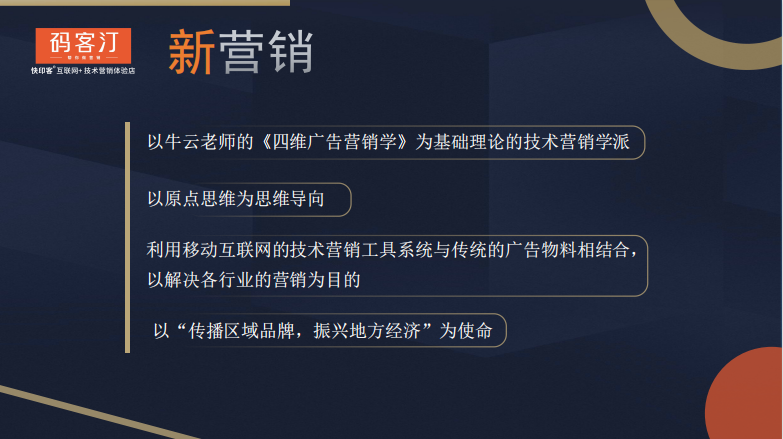 所谓新营销,就是以牛云老师的四维广告营销学为基础的技术营销理论,以原点思维为导向,利用互联网技术工具与传统物料相结合,达到精准获客的目的。张晓阳张总在实践中,通过协会的优质资源,赋能地方实体经济,构建新营销生态。