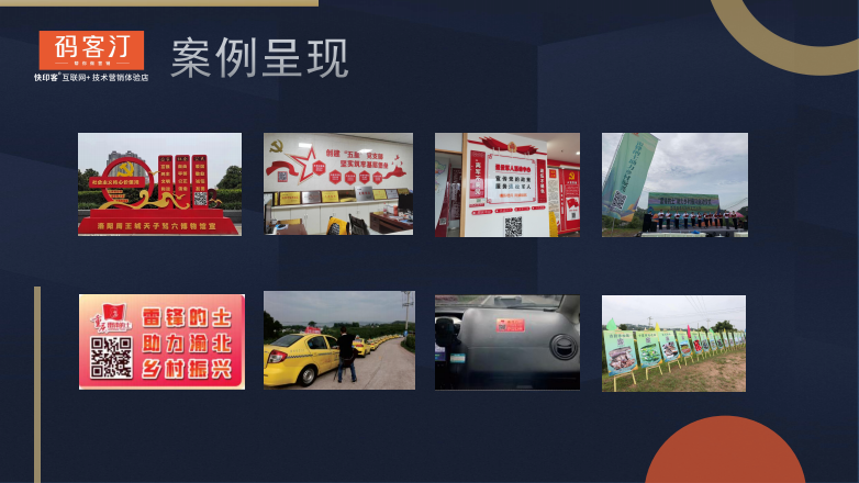 快印客全国有一万多家加盟店,而且快印客旗下还有码客汀和保时客两大品牌连锁店,已经成为了广告行业的标杆。我们可以把农特产品和乡村旅游与快印客的万店同播平台合作,与一万个加盟店建立联系从而赋能乡村振兴各产业。