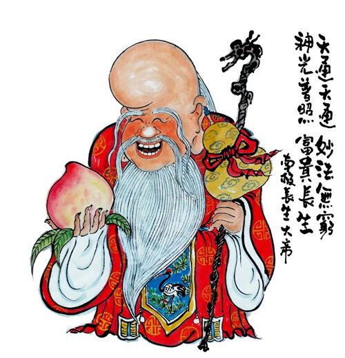 南极长生大帝,是中国民间信仰的长寿之神,又称南极仙翁、南极老人,形象一般是额秃顶广、鬚髮尽白、面容红润的老仙人,常乘白鹿或白鹤,持拐杖、仙桃等物,与诸童子戏耍。南极仙翁因为是长寿之神,极受老百姓的尊敬与喜爱。