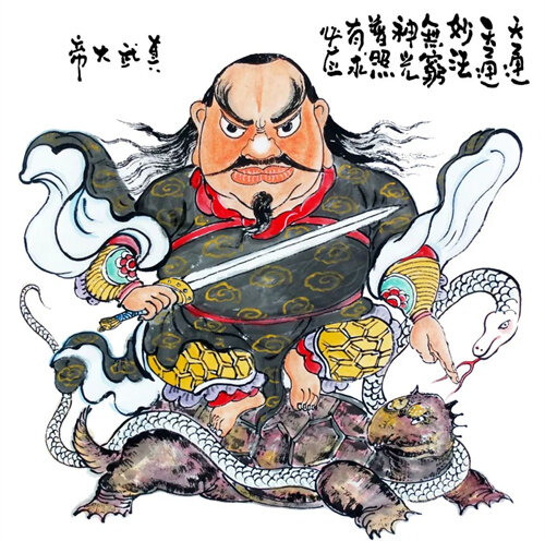 真武大帝,又称荡魔天尊,生而神灵,察微知运,勇猛刚正,发誓除尽天下妖魔,被封为北方之神,镇守北方,统摄玄武位。披发跣足、身着玄袍、金甲玉带,仗剑怒目,足踏龟蛇,象征人与万物生生不息,且玄武星为南斗,祭拜南斗可以增寿,实为司命之神。