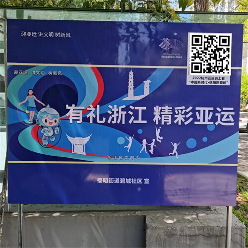 鸿睿星文化梁总运用“条幅 智慧云码”的形式,实现“线上 线下”结合,“码”上了解更多杭州亚运信息,让活动宣传更有效果。