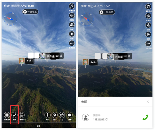 三、新增拨打电话功能。系统支持在720全景中预留联系电话,用户可直接一键拨号