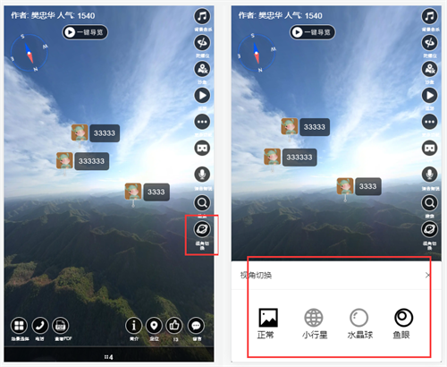四、增加多视觉切换 全屏浏览。支持正常视角、小行星视角、水晶球视角和鱼眼视频四种视角切换