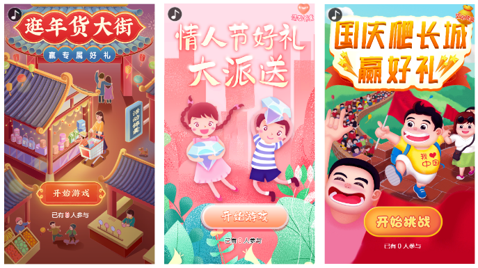 互动类上线了大量节假日主题的活动,像是新春年货逛大街、情人节好礼大派送、国庆爬长城赢好礼等,可以在一定程度上提高客户的积极性,给活动增添光彩。