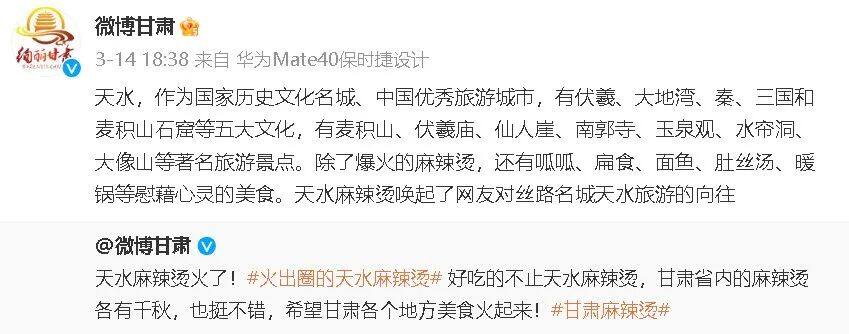 实际上,历史文化底蕴的天水不仅有麻辣烫,还有呱呱、扁食等特色美食。甘肃外宣办官方微博写道。的确,天水可不光有麻辣烫呢!