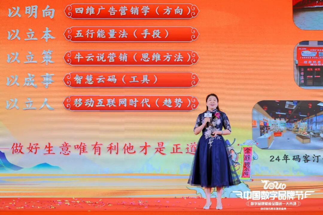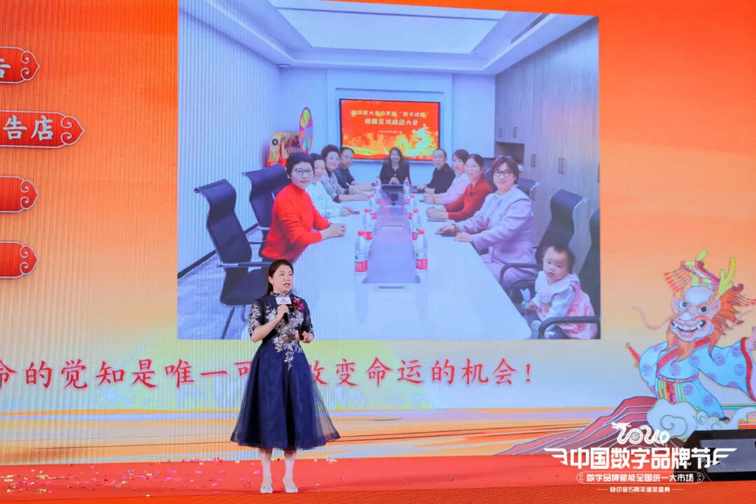 在2024中国数字品牌节数字品牌赋能全国统一大市场暨快印客15周年颁奖盛典现场,新疆保时客渠道、高原红广告任总分享了她是如何从广告行业转型到新广告领域,并在营销思维和认知维度上取得了显著提升。她从“觉知生命、体验生活、做好生意”三个层面阐述了自己是如何借助技术营销学、天通文创、离火战略计划赋能开展业务的。