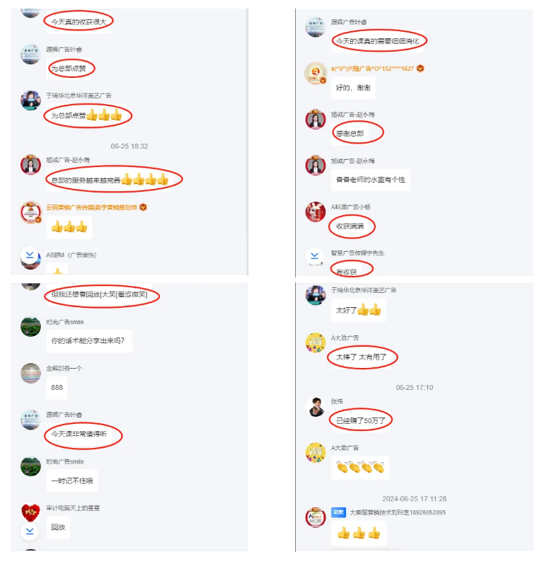 “太棒了 太有用了”、“已经赚了50万了”、“今天的课非常值得听”、“还想看回放”、“收获满满”、“为总部点赞”、“讲得太到位了”.......——学员们
