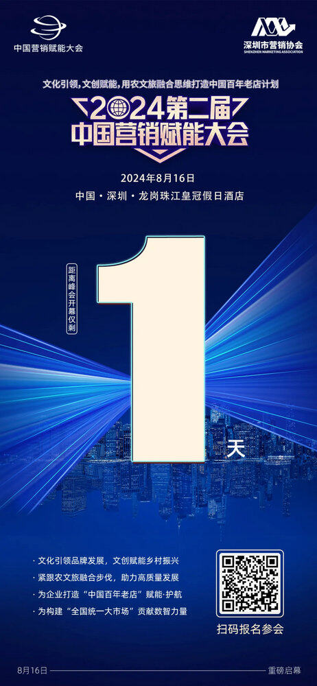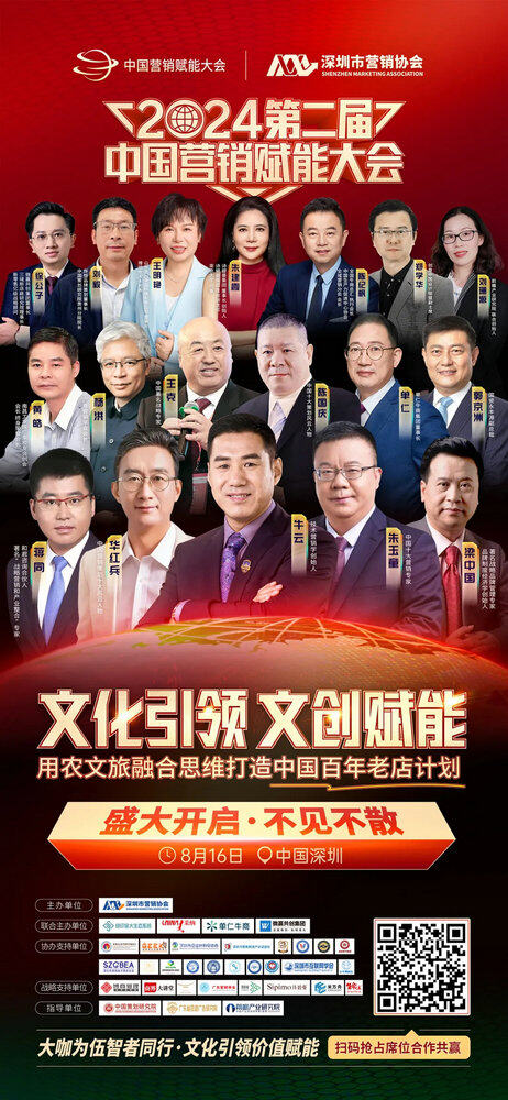 “文化引领 文创赋能,用农文旅融合思维打造中国百年老店计划”2024第二届中国营销赋能大会将于2024年8月16日在深圳龙岗珠江皇冠假日酒店隆重举行。