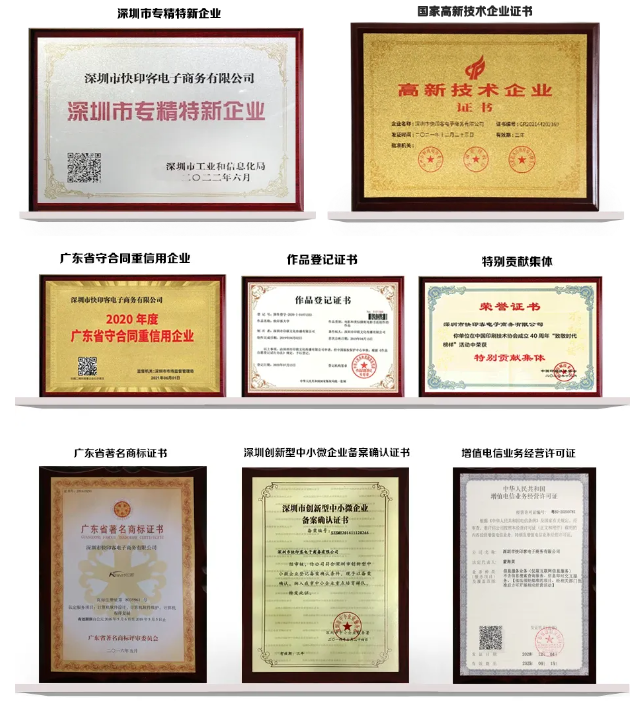 快印客拥有100多项软件著作权及专利产品,连续12年获得国家高新技术企业,荣获2021年深圳市"专精特新"企业,是深圳市创新型中小微企业、广东省著名商标企业、深圳市重点电子商务企业、广东省最具社会责任感企业,2019、2020年度连续荣获"广东省守合同重信用企业",2022年荣获"深圳市高新技术企业培育资助企业"。