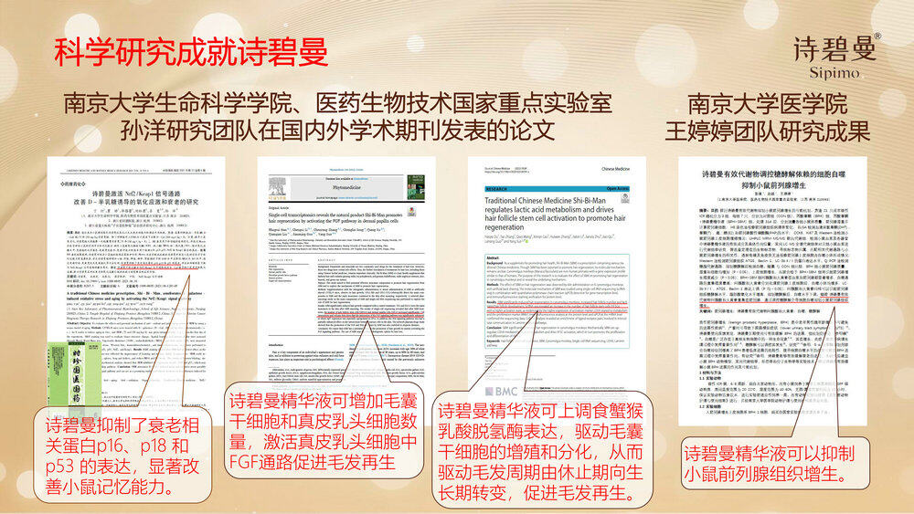 诗碧曼在国内外重要期刊上发表了多篇论文,论文表明诗碧曼不含染发剂成分,能够抑制衰老相关蛋白p16、p18、p53的表达,能够增加毛囊干细胞、修复毛囊乳头细胞。诗碧曼的外在表现是促进头皮健康、修复受损的头发、恢复头发光泽,呈现健康亮丽的形态,它的核心价值在于抗衰老。