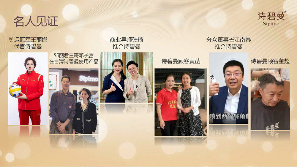 诗碧曼通过广泛的顾客群体和显著的使用效果,以及名人顾客的见证,展示了其产品的吸引力和有效性。10年来已有近百万用户从中受益,包括江南春、黄菡、董超、张琦、王丽娜等企业家名人为诗碧曼作效果见证,而朱总本人64岁了仍黑发如初。
