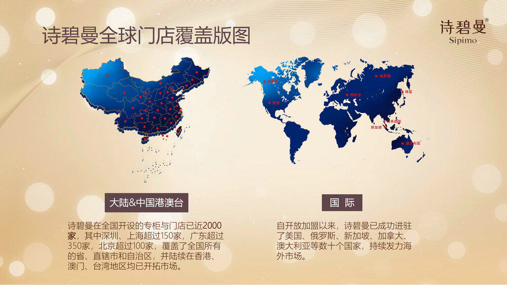 诗碧曼品牌在全球开设了近2000家门店与专柜,业务覆盖了包括港澳台在内的中国所有省市自治区,并成功吸引美国、新加坡、澳大利亚等十多个国家的精英人士代理加盟,开设养发馆、工作室。