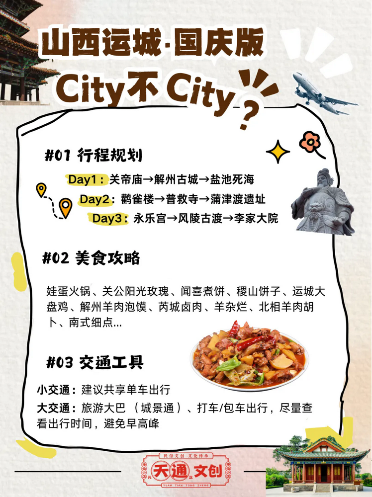 山西运城,国宝第一市,天下好运城,拥有着102处国宝单位,因“盐运之城”而得名,被誉为“晋南门户、山西粮仓、关公故里、华夏农耕文明的重要发祥地”。在这样的一座历史古韵的名城中,不仅承载着厚重的历史记忆,还有诸多非去不可的文化圣地。运城关帝庙,供奉着三国时期蜀汉名将关羽,走进庙宇,仿佛能够感受到忠义千秋的气息;鹳雀楼中,唐朝诗人王之涣留下千古绝唱《登鹳雀楼》,登上高楼,极目远眺,黄河之水尽收眼底...