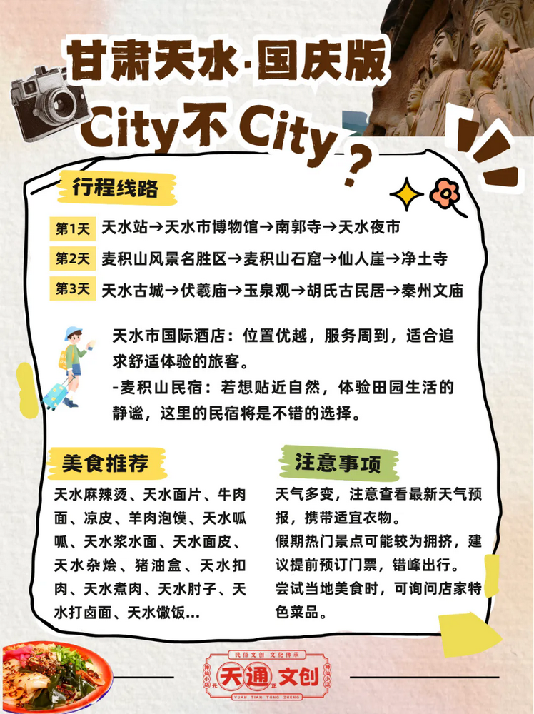 陇山苍苍,渭水泱泱。天水,一座由“麻辣烫”而火速出圈的历史文化名城,是中华民族和中华文明的重要发祥地之一,旅游资源富集,拥有不凡的自然环境与历史文化,造就了独特的天水文化,如赓续了千年文化根脉的伏羲庙、鬼斧神工的东方雕塑-麦积山石窟、“史前文明瑰宝”-大地湾遗址...无论是追寻文化遗迹,还是品尝当地美食,在这里,你都会找到答案。