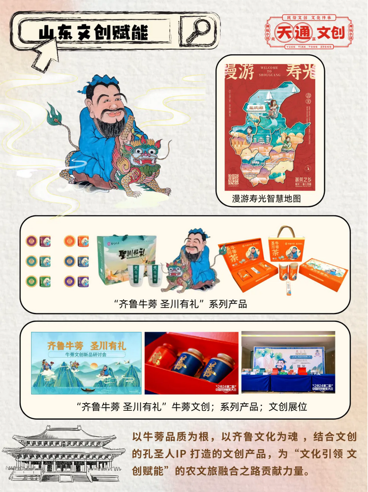 此外,山东作为孔圣人的故里,快印客结合天通文创打造的圣贤孔子ip,如为山东圣川食品科技打造的“齐鲁牛蒡 圣川有礼”策划方案,将传统包装升级为智慧型包装物,打造一系列具有地域特色和文创创意的ip产品,展现其山东的自然美景和深厚文化,推动乡村旅游业的特色发展。