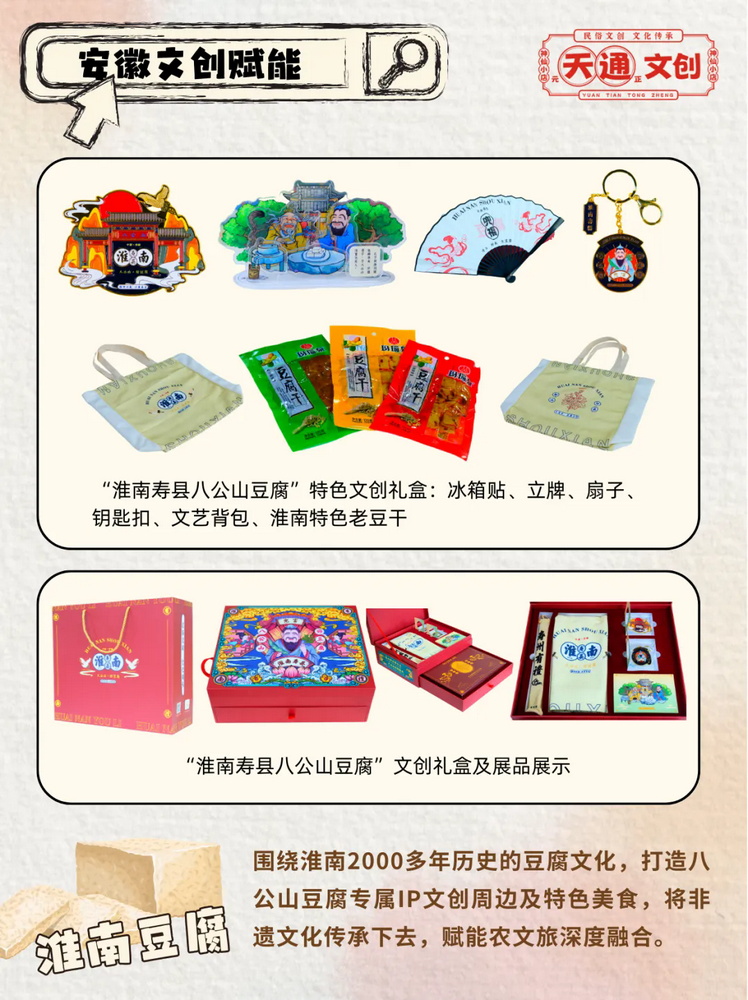 淮南也是豆腐的发源地,世界上第一块豆腐诞生于此,这里的豆腐,细腻嫩滑,入口即化,每一道以豆腐为主料的菜肴,都是对传统工艺的传承与创新。快印客旗下“天通文创”围绕八公山豆腐文化,设计“淮南寿县八公山豆腐”系列文创产品,让历史中的人物通过设计创意具象化,形成了一系列具有个性特色的文创周边。这个国庆,一起打卡淮南、潮玩文创,探索历史的奥秘吧~