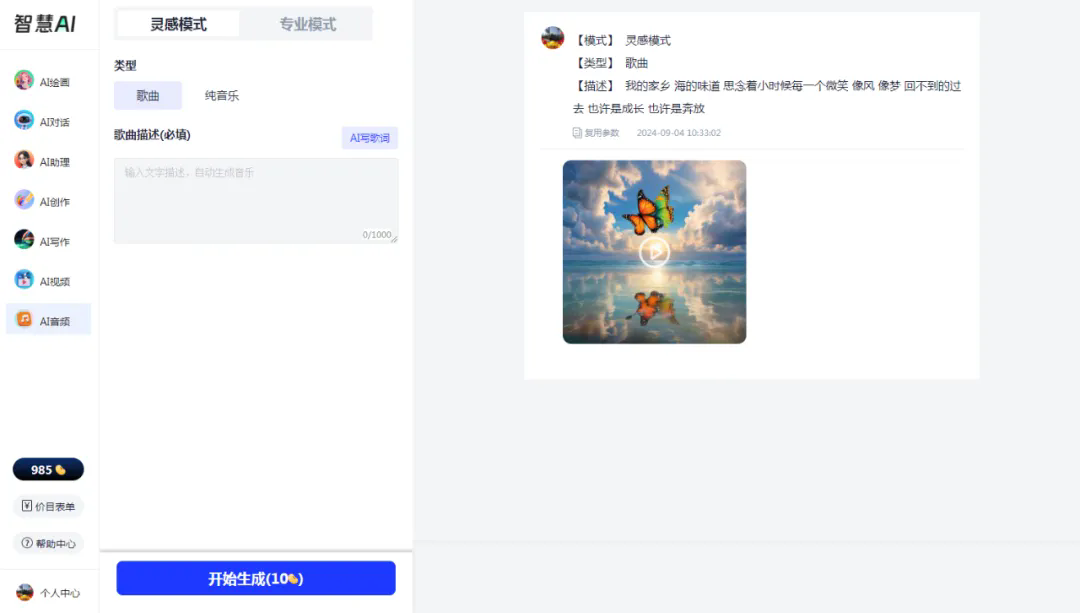 通过ai技术来创作纯音乐、歌曲,ai音频通过大模型,自动生成音乐的旋律、和声、节奏、歌词扩写等,根据用户设定的风格、情感等参数,只要有创作灵感和思路,就能为你自动生成符合要求的音乐作品,为音乐创作和制作带来了全新的可能性和便利性。