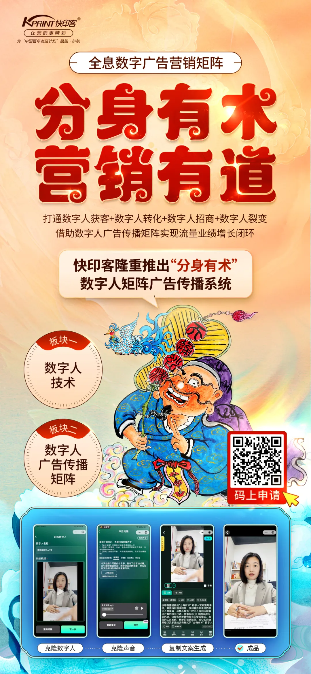 随着技术的不断进步,ai数字人正以独特的优势成为推动行业变革的重要力量。快印客帮助凯发娱乐下载的合作伙伴紧跟ai数字赋能风口,通过打造“全息数字广告营销矩阵”,以“分身有术,营销有道”的科学准则,助力企业在艰难的市场环境下实现破局,为打造百年老店提供强大技术支撑,真正帮助千行百业进行赋能。