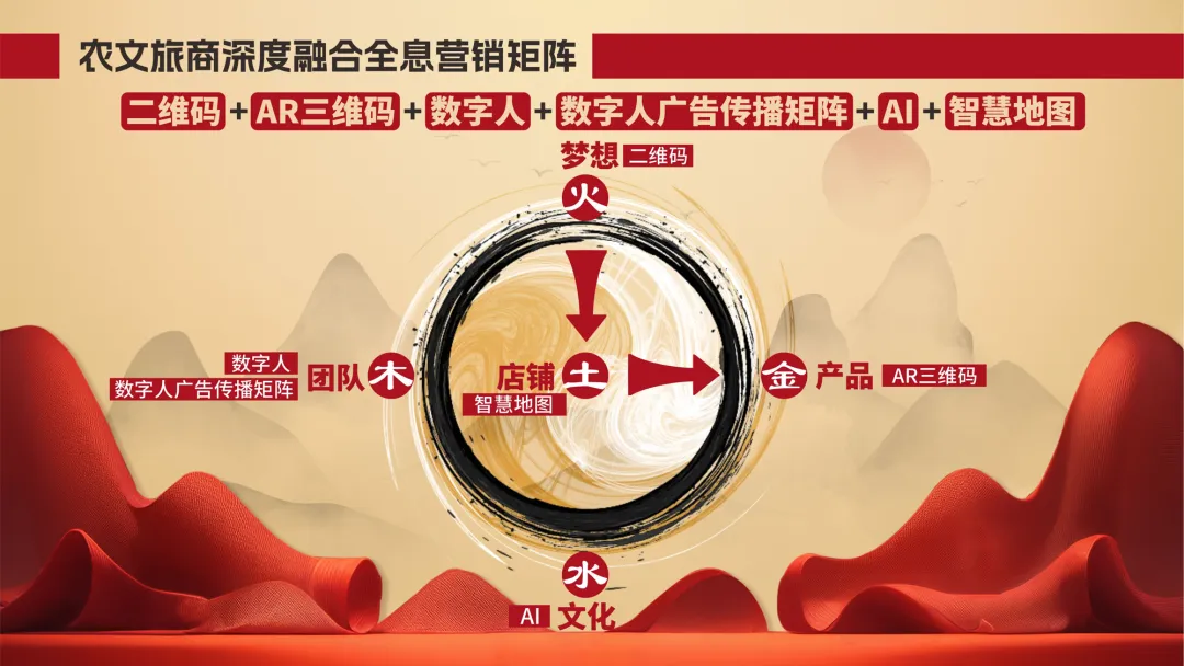 农文旅商深度融合全息营销矩阵,借助“二维码 ar三维码 数字人 数字人广告传播矩阵 ai 智慧地图”模式,结合数字品牌赋能 文创ip赋能体系,为农文旅商产业注入新的活力与价值。