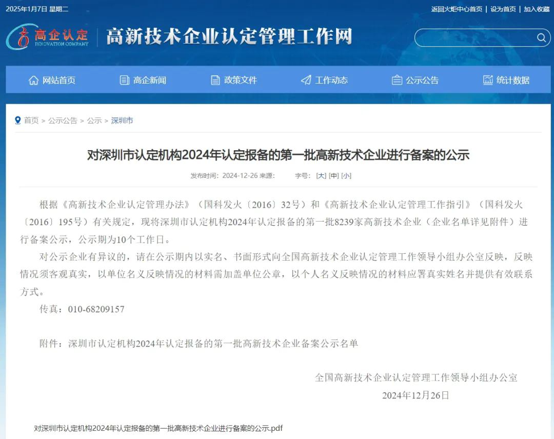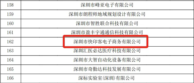 近日,高新技术企业认定管理工作网发布《对深圳市认定机构2024年认定报备的第一批高新技术企业进行备案的公示》,深圳市快印客电子商务有限公司凭借出色的创新能力、研发投入、团队实力及发展潜力,成功被认定为国家高新技术企业,荣获国家级“高新技术企业”荣誉称号。