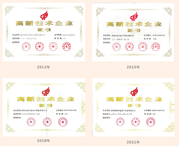 2012年,快印客首次取得高新技术企业资质以来,分别于2015年、2018年、2021年、2024年连续5次被认定为国家级“高新技术企业”,是国家双软认证企业,荣获深圳市2021年度“专精特新”企业及2021年深圳市专精特新中小企业复核通过企业,还是深圳市创新型中小微企业、广东省著名商标企业、深圳市重点电子商务企业、广东省最具社会责任感企业、2019、2020年度连续荣获“广东省守合同重信用企业”、2022年荣获“深圳市2022年高新技术企业培育资助企业”。