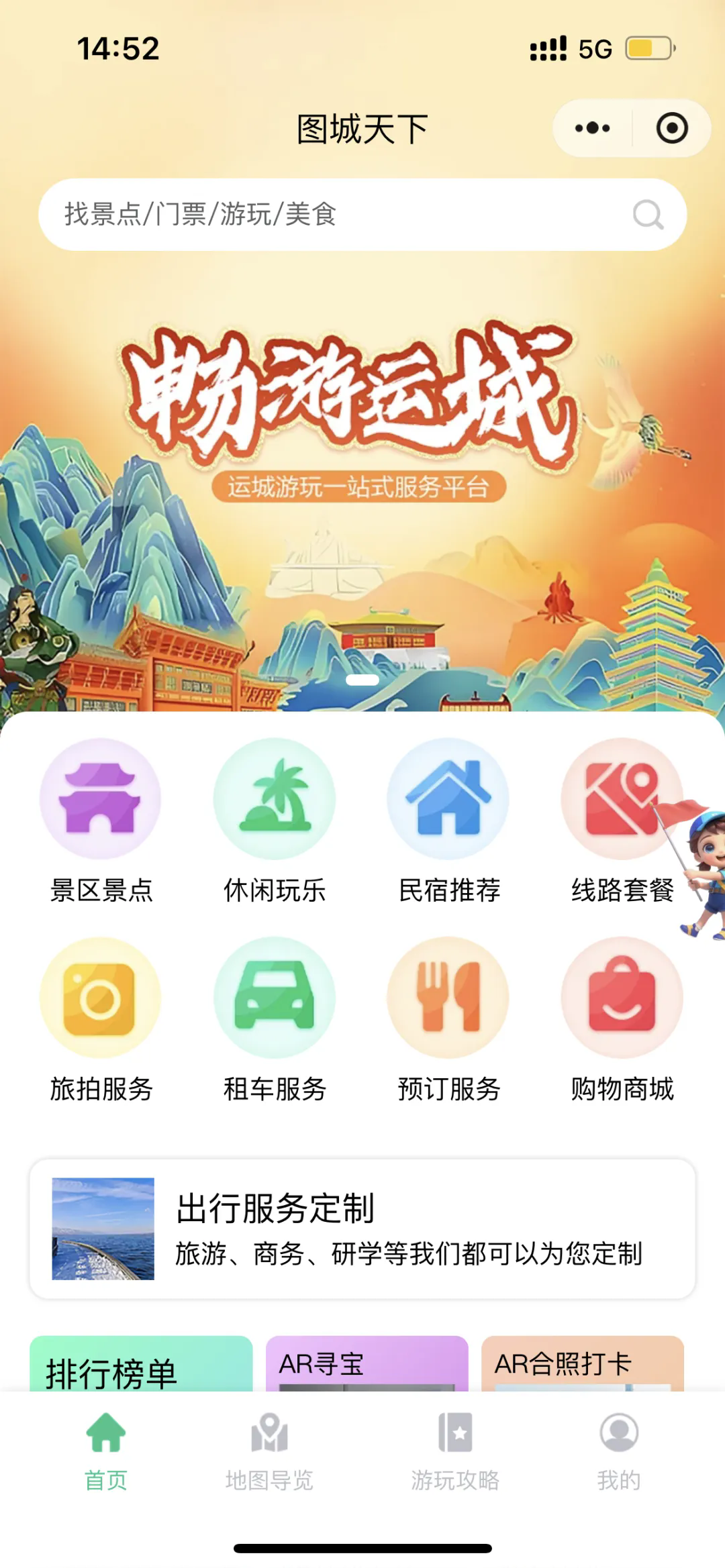 图城行动平台具有出行服务定制、景点游览、路线推荐、ar互动、游玩攻略、住宿攻略等多种功能,为游客提供便捷的旅游信息化服务。