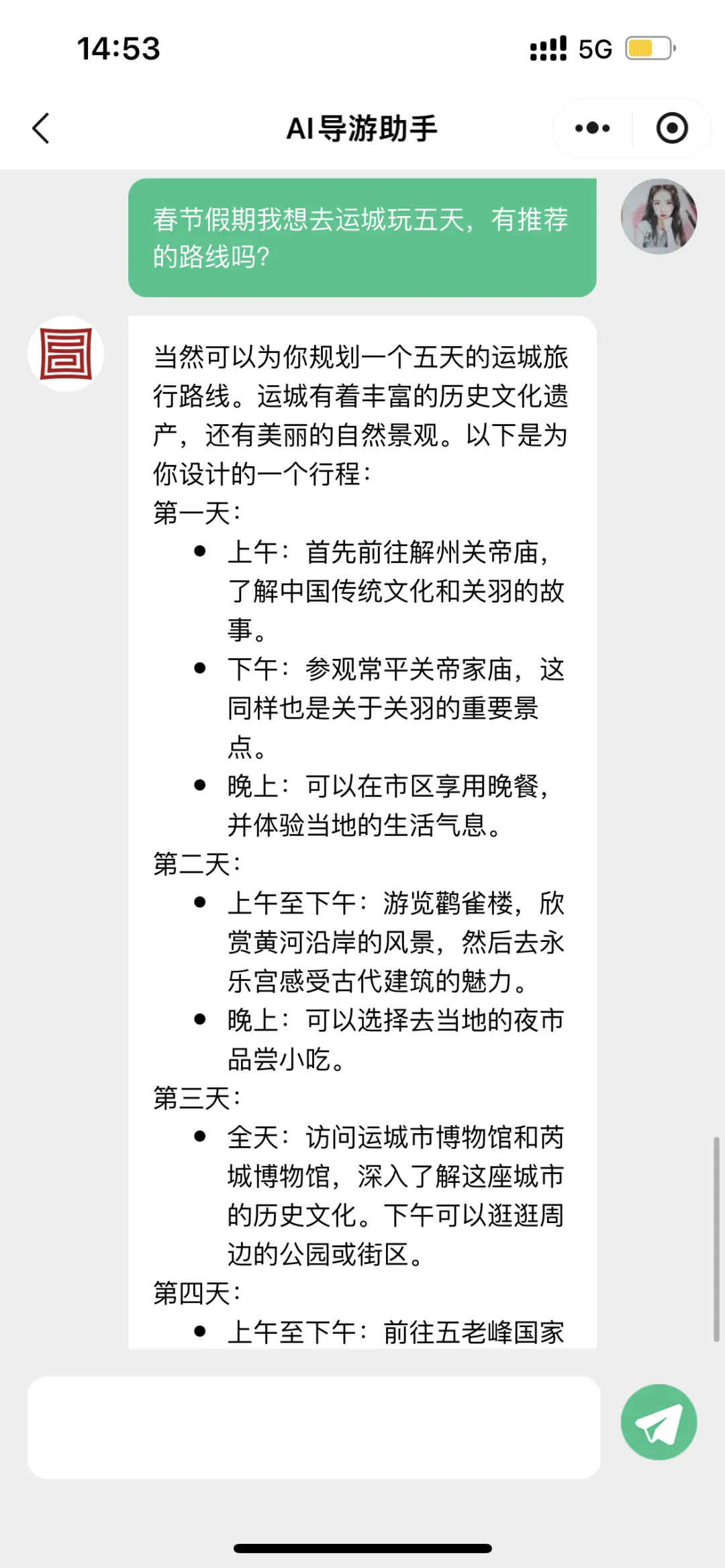 “春节假期我想去运城玩五天,有推荐的路线吗?”