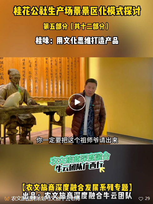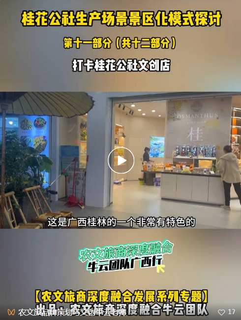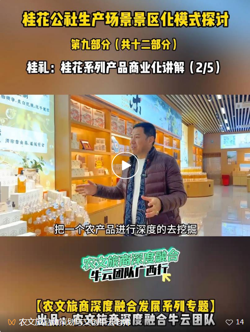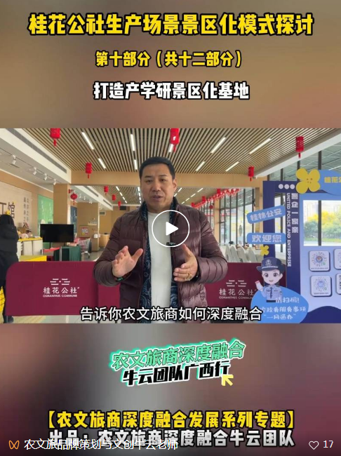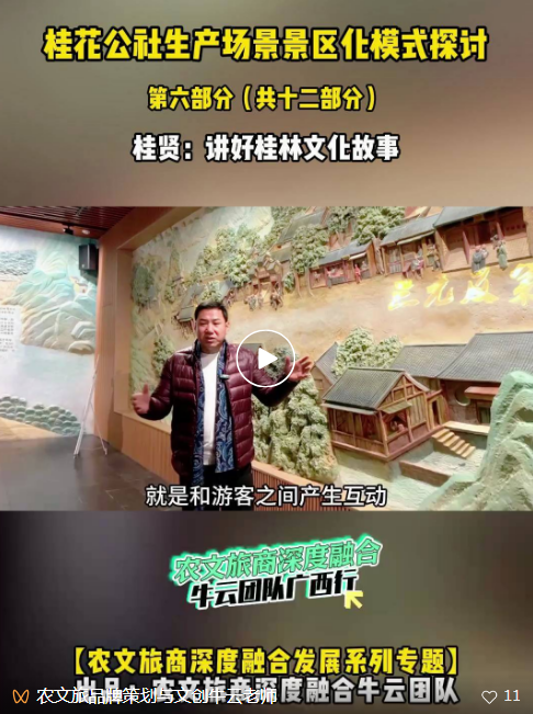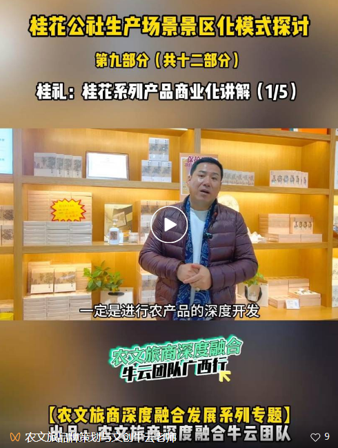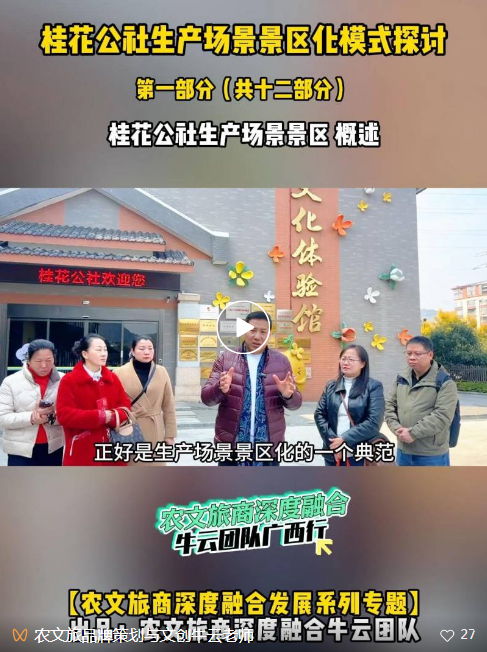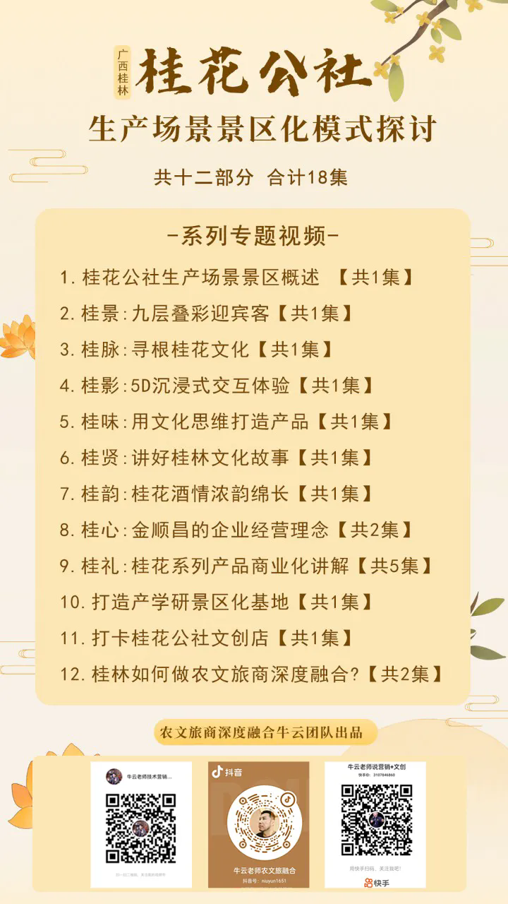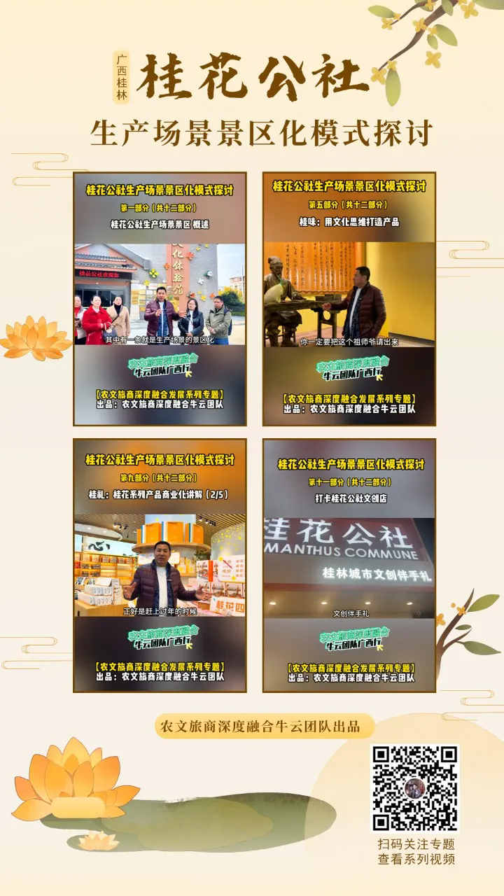继《莫干山民宿生态打造详解》农文旅商深度融合系列专题之后,农文旅商深度融合牛云团队走进广西桂花公社进行调研,推出《桂花公社生产场景景区化模式探讨》短视频系列专题。