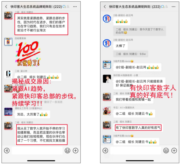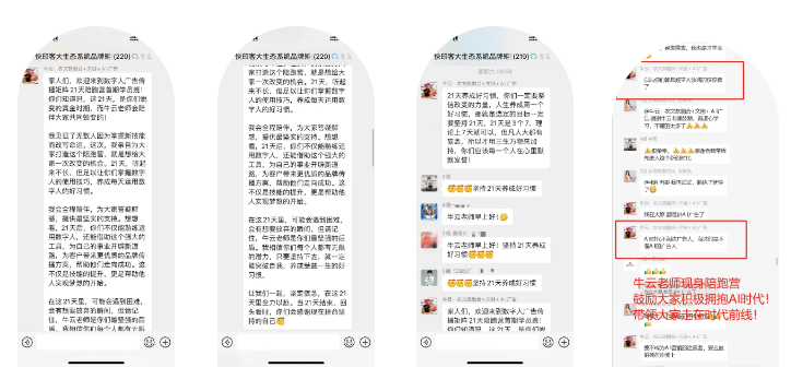 在快印客全息ai数字人陪跑营的群聊中,传奇的牛云老师亲自闪亮登场!他不是匆匆过客,而是带着十足的诚意,全心全意为学员们加油鼓劲,提供最专业、最贴心的指导与支持。