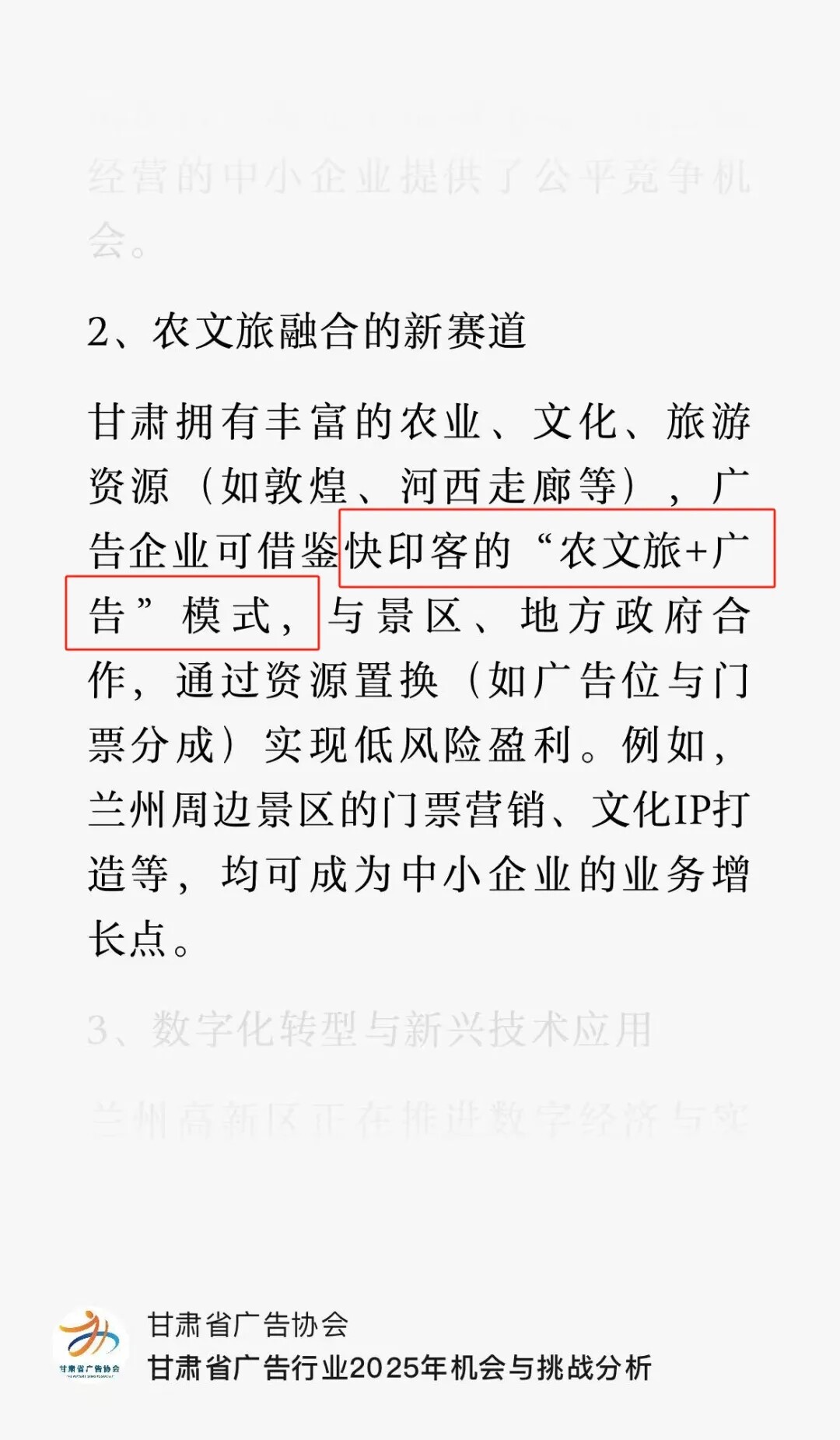近日,快印客“农文旅 广告”模式被甘肃省广告协会引用,并向全体单位推荐!该模式不仅能为广告企业开辟新赛道,更为全国各地将丰富文旅资源转化为产业动能注入了全新活力!