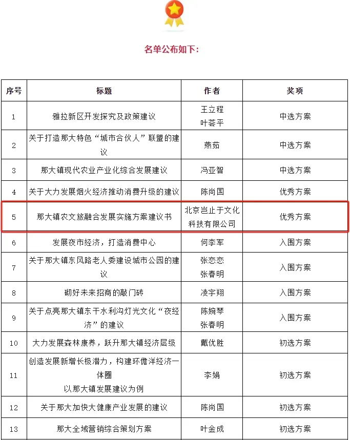 北京岂止于文化彩总为海南那大镇精心撰写农文旅商融合方案,为县域发展贡献智慧。在693份方案中脱颖而出,成功进入前五名,斩获优秀方案殊荣!