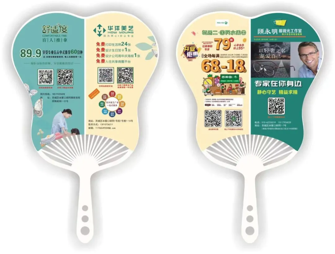 华洋美艺于总用众筹广告扇玩转跨界营销,成功整合多行业资源:为电信公司定制5万 把广告扇抢占线下流量,帮医院打造宣传广告扇,更带动美容院后续追加灯箱广告投放!一把小扇子,撬动大生意!