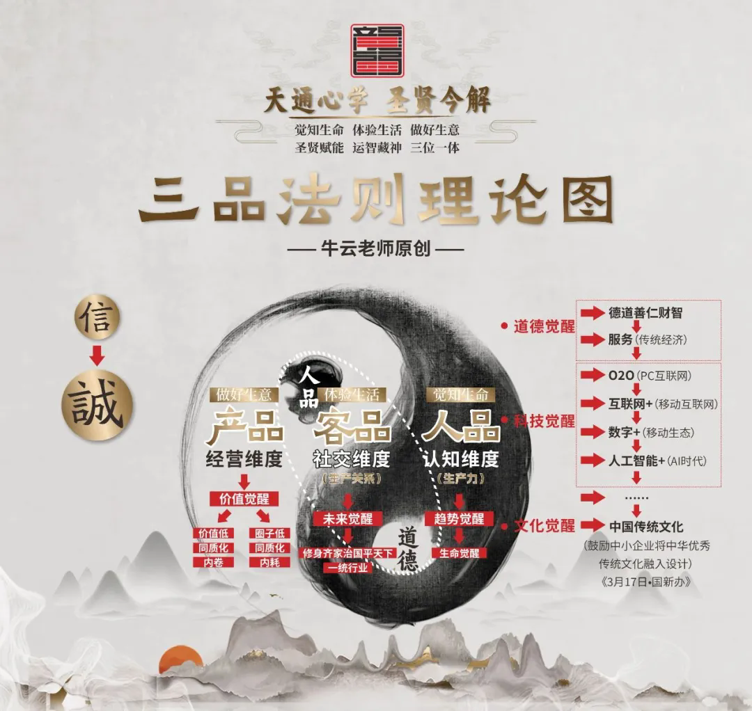 牛云老师于2025年4月9日首提“诚商”理论,它是基于天通心学“三品法则”实证研究而诞生的一门哲学理论体系,旨在用东方哲学对数字经济时代商业诚信底层逻辑进行深刻重构,让商业回归“诚信为本”的原点和本质,重构中国商业文明新生态,这标志着中国未来40年“诚商时代”正式启航。